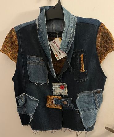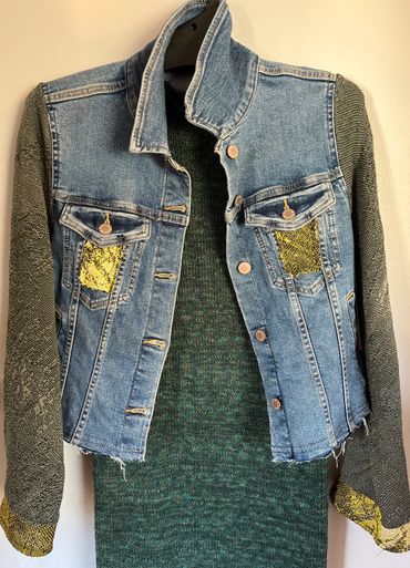 DENIM REMADE - brilliant "BIKER" Jacket - our knitted sleeves in dark green, size M - one only - $169-
