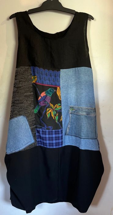 BLACK LINEN TUNIC - with denim pockets and trim at hem - (tulip shape)- Size L- XL - $145